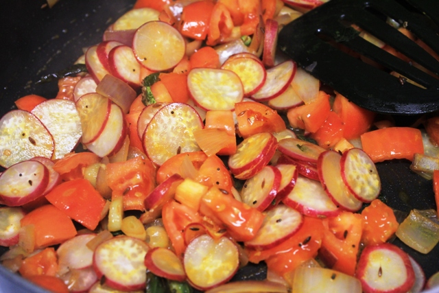 In a deep saucepan, add a tsp of oil followed by onion, green chillis and sliced radish. Cover the pot and cook on medium heat until the radish slices soften a bit.You can sprinkle some water to avoid if from burning. You can also use a microwave for this step.